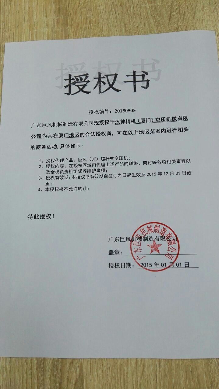 2013年8月福建建陽(yáng)長(zhǎng)風(fēng)授權(quán)廈門(mén)漢鐘精機(jī)有限公司----總代理經(jīng)銷(xiāo)權(quán)